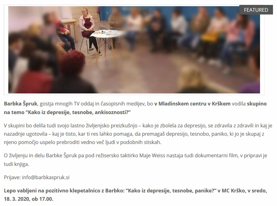 Lepo vabljeni na pozitivno klepetalnico z Barbko: “Kako iz depresije, tesnobe, panike?” v MC Krško, v sredo, 18. 3. 2020, ob 17.00.